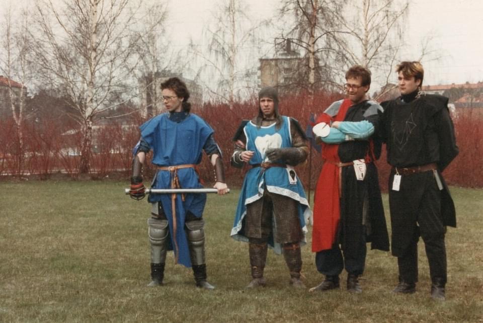 Tournaments can be more than fighting. Fighters very focused at sewing. probably 1987?